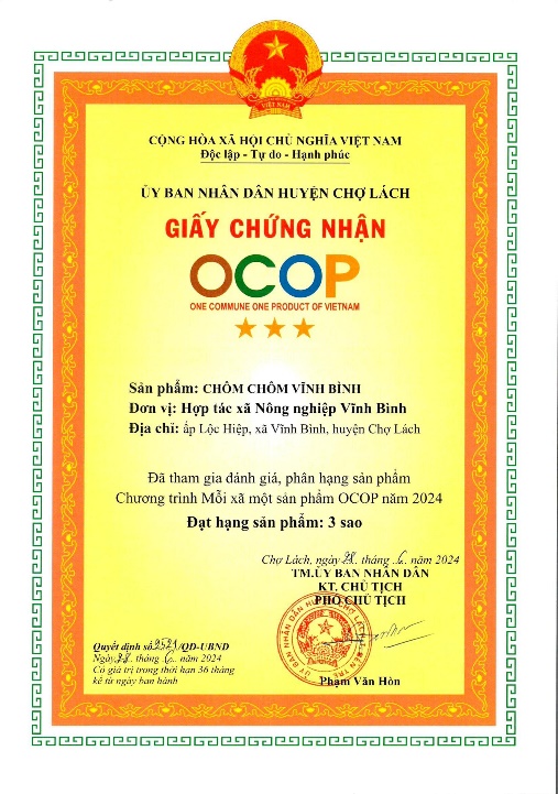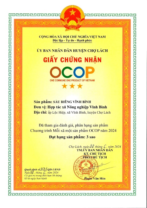 Hợp tác xã (HTX) nông nghiệp Vĩnh Bình là một trong những hợp tác xã tiêu biểu của huyện Chợ Lách, tỉnh Bến Tre. Với tâm huyết và nỗ lực không ngừng, trong những năm qua HTX đã thành công trong việc đưa các sản phẩm cây ăn trái như sầu riêng, chôm chôm, nhãn...lan tỏa rộng rãi ở khu vực tronng và ngoài tỉnh.
